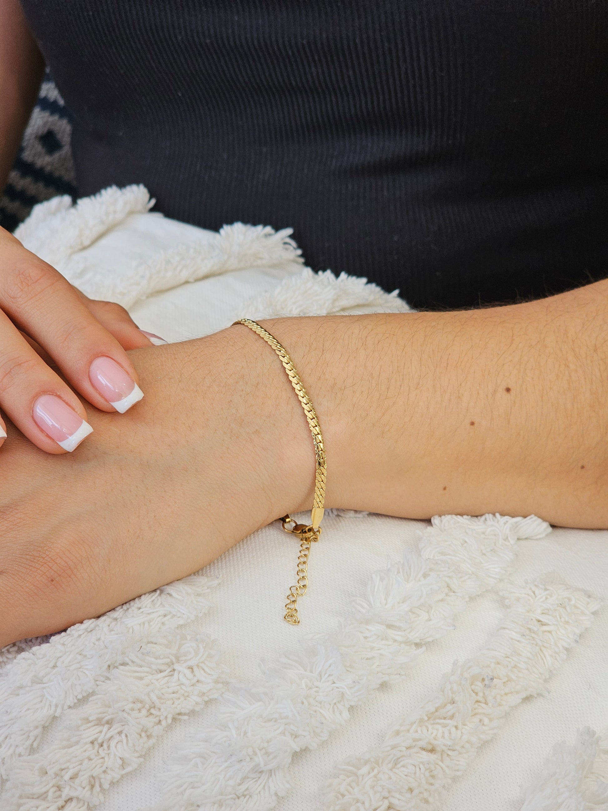 Delicada, brillante y con un diseño grabado que aporta un toque único. Esta pulsera es perfecta para quienes buscan elegancia discreta y durabilidad en una joya versátil y atemporal.